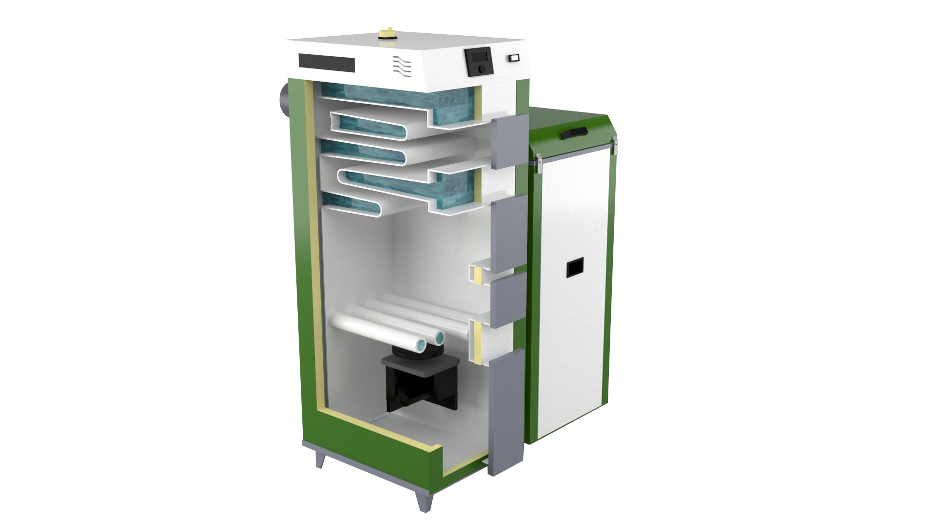 В традиционной камере сгорания применяется дополнительный вентилятор наддува, позволяющий получение оптимальных параметров сжигания твердого топлива, а также удержание температуры на заданном уровне. Благодаря этому решению получается продолжительное время работы котла на одной полной загрузке топливом, а также имеется возможность для сжигания не только каменного угля и дерева, но и угольной пыли.